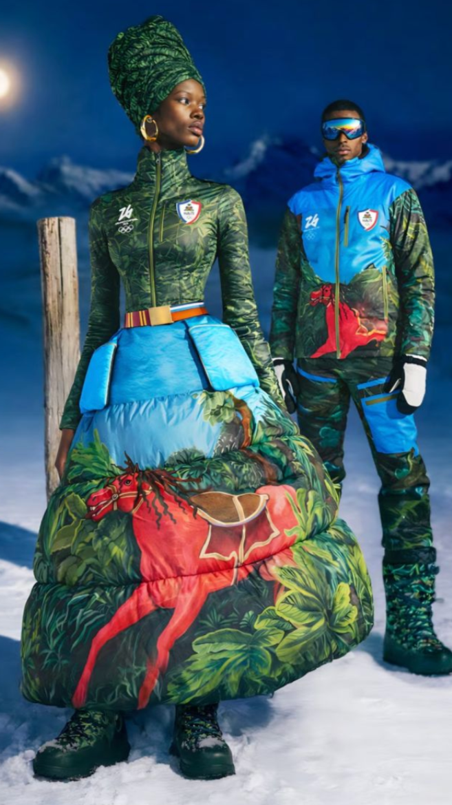 One of the most powerful statements of the Opening Ceremony came from Team Haiti. Their looks were created by Stella Jean, the Haitian-Italian designer based in Milan known for weaving cultural storytelling into her work. Each piece was painted by hand, referencing both nature and a significant work by Haitian artist Edouard Duval-Carrié. The piece depicts revolutionary leader Toussaint Louverture riding a red horse. Because of International Olympic Committee rules around political neutrality, Louverture himself couldn’t be shown. Jean’s brilliant work-around gave a clear nod to the figure with a handpainted red horse, set against wild greenery and a cloudless sky.