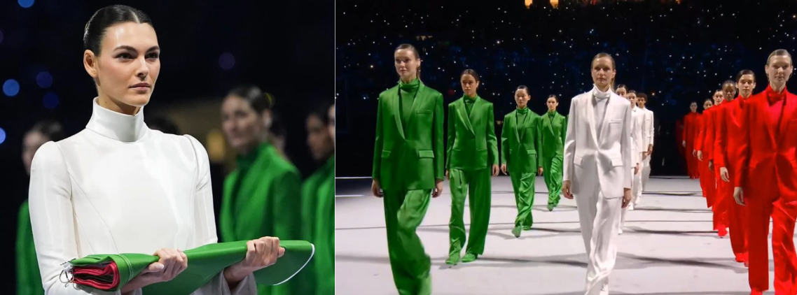 Few moments were as visually striking as Italy’s tribute to Giorgio Armani during the opening ceremony. In a monochromatic display, 60 models wore tailored Armani suits in red, white, and green, mirroring the Italian tricolore. It was sharp, theatrical, and unmistakably Armani.